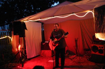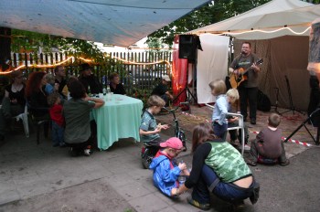 Ein lauer Samstagabend in den Hinterhöfen von Connewitz. Super, was da einige Nachbarn zusammengestellt haben: eine private Messe für Hinterhofkultur – von der Bastelstraße bis zur Fotoaustellung. Und mittendrin eine Bühne, auf der ich mich tummeln durfte. War ganz ungewohnt, mal wieder alleine Musik zu machen, hat aber geklappt! Cool, dass sich weder Kinder noch Erwachsene vom Regen beeindrucken ließen und mir zugehört haben. (Daniel)