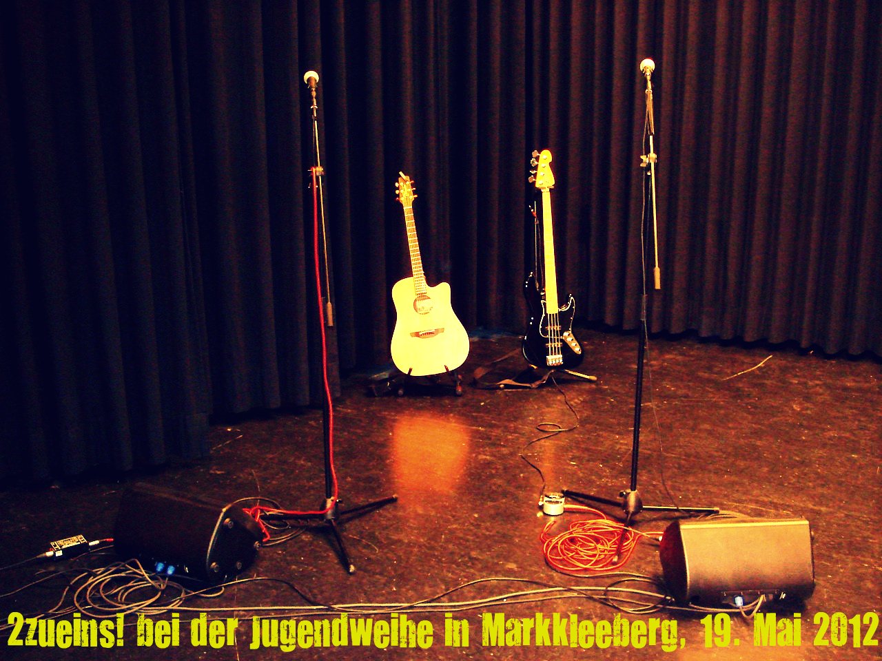 Das erste 2zueins!-Konzert im Jahr 2012 stieg im Lindensaal in Markkleeberg. Mehr als 400 stolze Eltern, Großeltern, Tanten, Onkels, Cousins, Geschwister und Lehrer liessen hier Jugendliche hochleben, die ihre Jugendweihe feierten. Zwischen vielen guten und lieben Worten an die jungen Erwachsenen: wir. Vier Lieder durften wir zum Besten geben, dazu ein paar Begleit- und Hintergrundmusiken. Schön war’s – und wem’s gefallen hat: am 2. Juni spielen wir beim Stadtfest in Leipzig auf dem Marktplatz, 18.15 Uhr geht’s los!